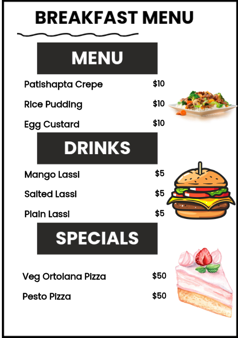 Organize items logically with clear headings and descriptions. Use colors that complement your restaurant's theme. Highlight popular dishes or specials to draw attention.